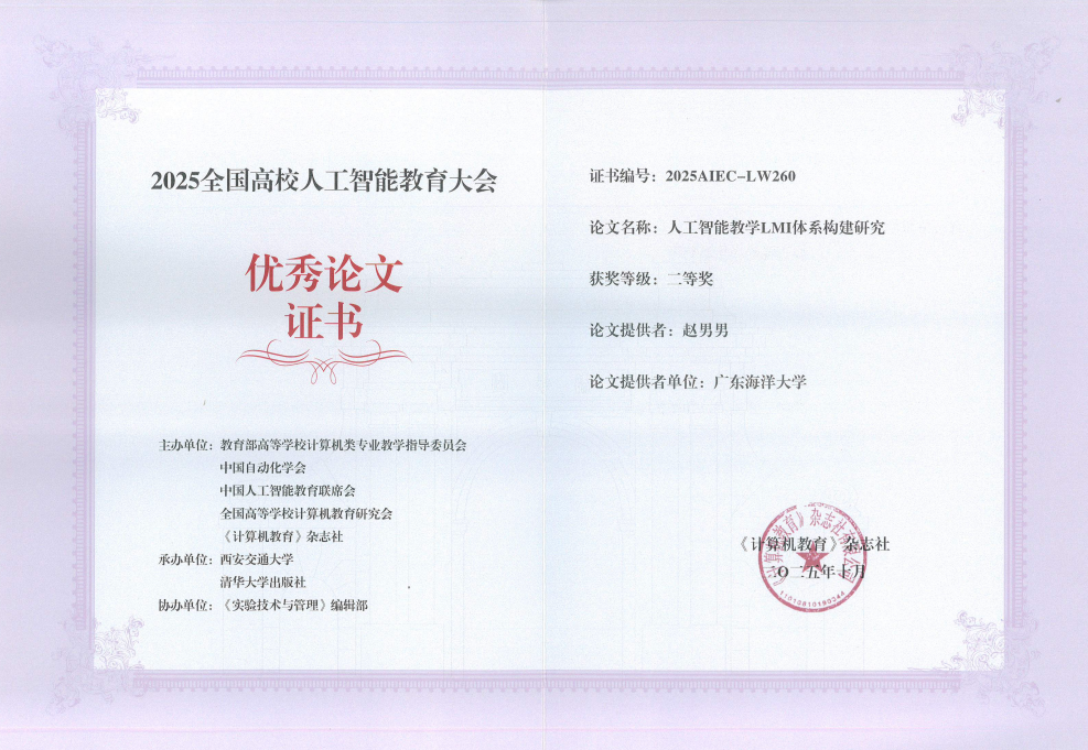 当晚的优秀论文颁奖环节中,赵男男副院长提交的学术论文从众多投稿中脱颖而出,荣获大会优秀论文奖。该论文聚焦“大模型技术背景下海洋人工智能人才培养体系创新”,结合广东海洋大学学科特色,提出“核心课程 + 海洋场景实践 + 产教协同” 的三维培养模式,系统阐述了如何将大模型技术融入课程设置、如何依托海洋信息技术打造特色实践平台等关键问题。论文中关于校企联合技术攻关、交叉学科融合的研究成果,与大会 “人工智能赋能教育与专业教育双向融合”的主题高度契合,得到由张涛、孙宏滨等专家组成的评审委员会的高度评价。