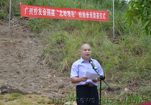海大广州校友会的校友代表牟晋军在仪式上致辞,表达了对母校的祝福和感恩。他说:“广州校友会能为母校的人文建设做贡献,非常荣幸,‘北岭观花’校园景观可以看作是我们广州校友会根在海大、心向海大的一个精神寄托,希望日后建成,它能成为海大文化的一个载体,也希望它能成为海大未来千万学子感恩之心的萌芽之地。”最后他深情祝愿海大的教育事业越办越好,更上一层楼。