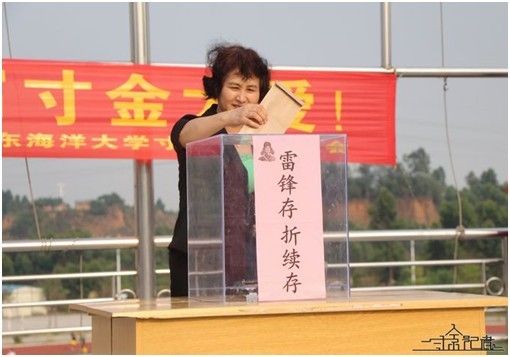 活动伊始,寸金学院各位领导老师、学生、商家代表陆续走到“雷锋存折”续存台,在捐款箱中投入了自己的“爱心存折”。