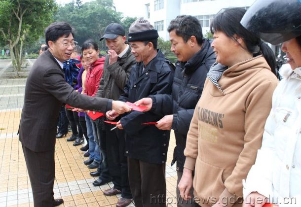 龙腾千样景,风雨万般春。1月23日是龙年春节,上午,何真、容景春、张兰英、陈泽球、叶春海、朱坚真等在家校领导,在微风细雨的霞山校区球场,与在湛过节的干部职工相约辞旧迎新的传统仪式——春节教工团拜会,在教工歌舞表演的喜庆热烈中展望了活力龙年的美好前景,并携喜气,冒寒气,分头带领有关部门领导慰问了主校区、霞山校区和海滨校区的值班干部职工,向他们送去节日的慰问和象征大吉大利的新年“红包”。