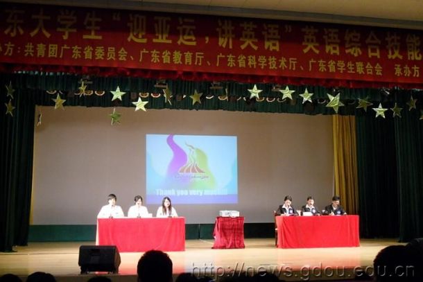 6月20日,由共青团广东省委员会、广东省教育厅、广东省科学技术厅和广东省学生联合会主办的广东大学生“迎亚运,讲英语”英语综合技能大赛决赛在广东外语外贸大学报告厅举行。从六十二支复赛队伍中脱颖而出的十支决赛队伍分别来自广东省的不同高校,我校代表队也在本次角逐之列。最终我校学生以出色的表现与广东外语外贸大学同时获得了二等奖。