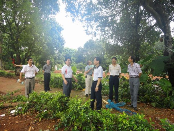 5月28日上午,校长何真、副校长陈泽球率领校长办、后勤管理处、基建处、综合服务中心等部门负责人巡视西区校园,就校园环境整治问题进行现场办公。