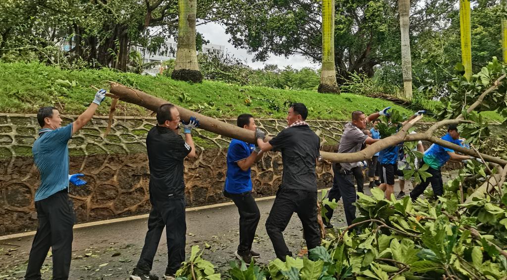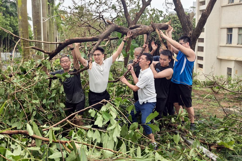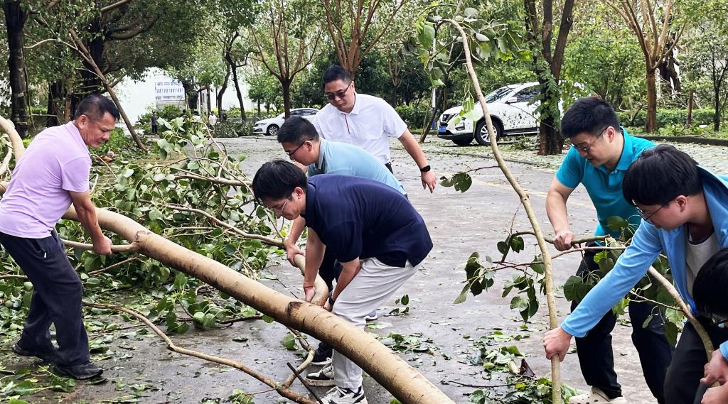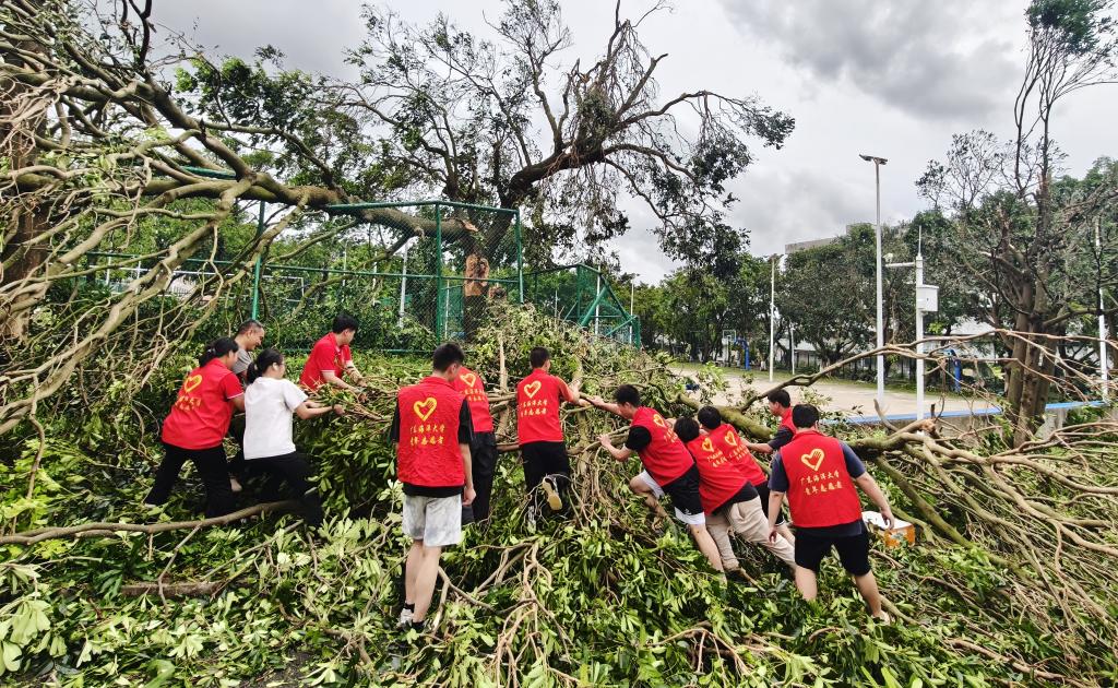 灾情就是命令,旗帜彰显担当。台风过后,学校党委第一时间发出号召,机关党委等各基层党组织闻令而动,迅速组建起一支支由党员干部、党员教师和学生党员组成的“党员突击队”“党员先锋队”。他们手持锯子、铁锹等工具,冲锋在灾后重建第一线:在主干道上,他们协力将倒伏的大树切割、搬离,清理交通障碍。在校园公共区域内,他们积极参与积水排放、淤泥清扫、残枝败叶清理,以及受损设施的初步修复工作,争分夺秒恢复校园正常秩序。“作为一名党员,这个时候就应该站在最前面,用我们的努力,尽快为师生恢复一个安全、整洁的学习生活环境。”一名参与重建清理工作的党员干部表示。此外,学校50余名党员志愿者还积极响应湛江市灾后恢复号召,深入海头港社区开展志愿服务。他们协助清理社区道路,用实际行动践行初心使命,展现了学校党员服务社会、勇于担当的良好形象。