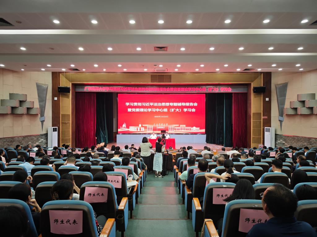 10月9日,学校在湖光校区广学楼多功能厅举行学习贯彻习近平法治思想专题辅导报告会暨学校党委理论学习中心组(扩大)学习会。全国人大代表、重庆市人大常委会委员、西南政法大学教授付子堂作专题辅导报告,学校领导、党委委员,全体中层干部、各单位部门法治工作联络员以及法政学院师生代表共300余人参加本次学习。学校党委书记杨洲主持会议并讲话。