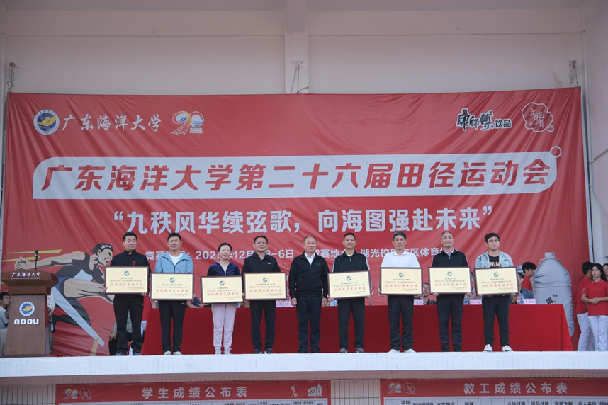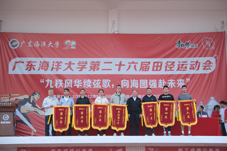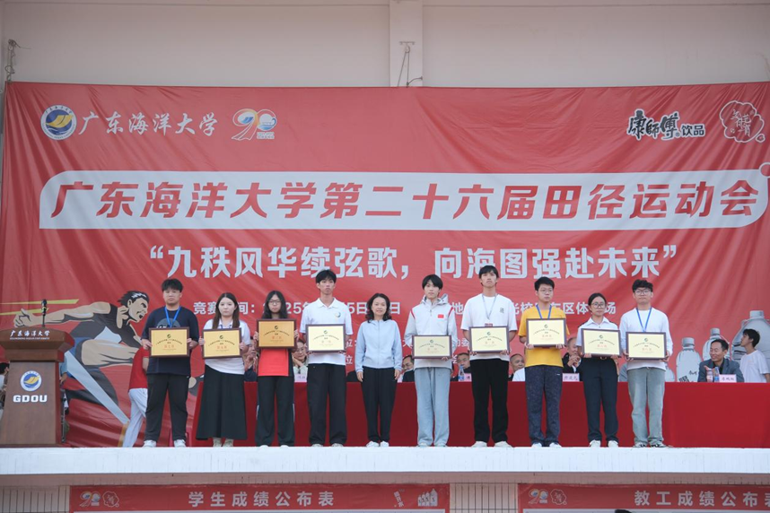 闭幕式上,与会领导分别为获奖代表团队颁奖。体育与休闲学院、阳江校区、滨海农业学院、经济学院、管理学院、化学与环境学院、船舶与海洋学院、电子与信息工程学院、数学与计算机学院分别荣获学生组团体总分前八名;体育与休闲学院工会、后勤工会、中歌艺术学院、机关工会、机械工程学院工会、电子与信息工程学院工会、水产学院工会、滨海农业学院工会分别荣获教工组团体总分前八名;船舶与海运学院、管理学院学生代表队荣获“体育道德风尚奖”;滨海农业学院、经济学院学生代表队荣获“优秀组织奖”。