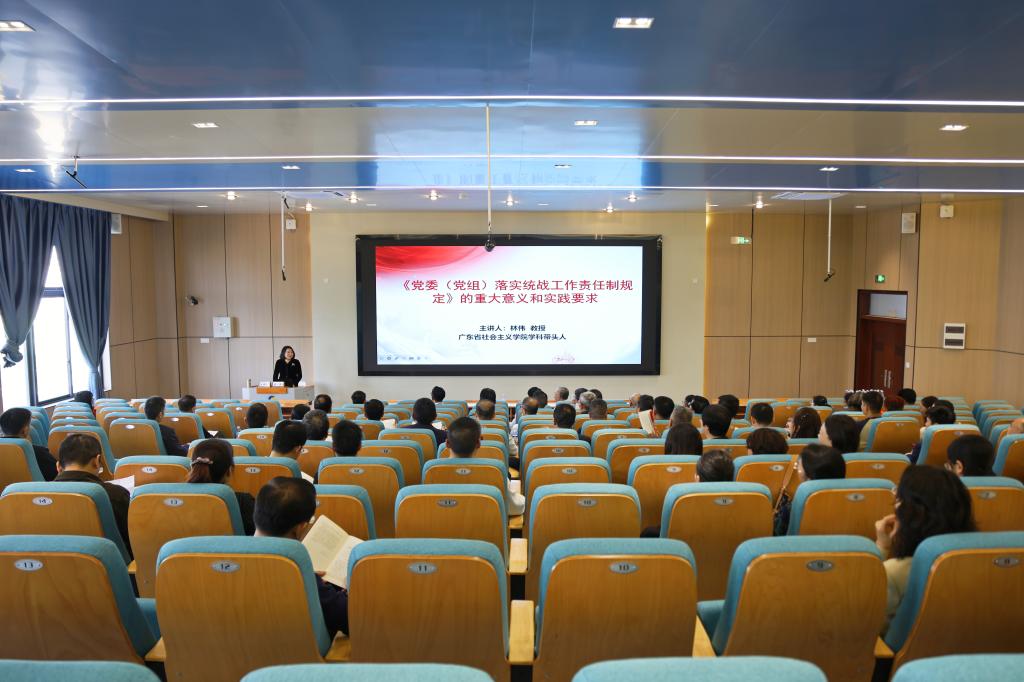 为推动我校统战工作再上新台阶,为学校高质量发展凝聚最广泛的人心和力量,12月17日下午,学校在湖光校区博文楼A302召开贯彻落实统战工作责任制专题培训会。广东省社会主义学院学科带头人林伟教授应邀作专题报告。学校党委副书记谭平,党委常委、宣传统战部部长林宇,统一战线工作领导小组成员单位主要负责人,各二级党组织书记、统战委员、统战联络员参加培训会。谭平主持会议。