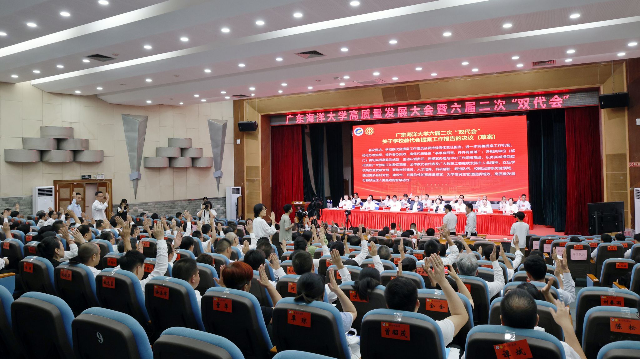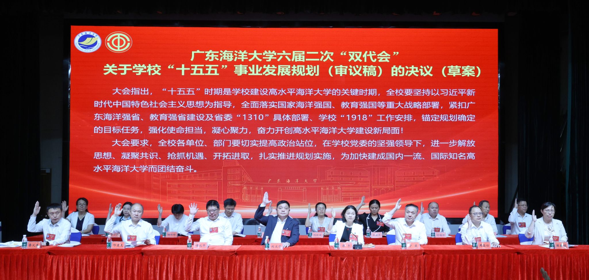 大会表决通过了关于学校工作报告、学校工会工作报告、学校财务工作报告、学校“十五五”事业发展规划(审议稿)、学校学术委员会年度工作报告、学校教代会提案工作报告、学校工会财务工作报告、学校工会经费审查委员会工作报告等决议(草案),宣布了《广东海洋大学2026年民生实事项目》推选结果。