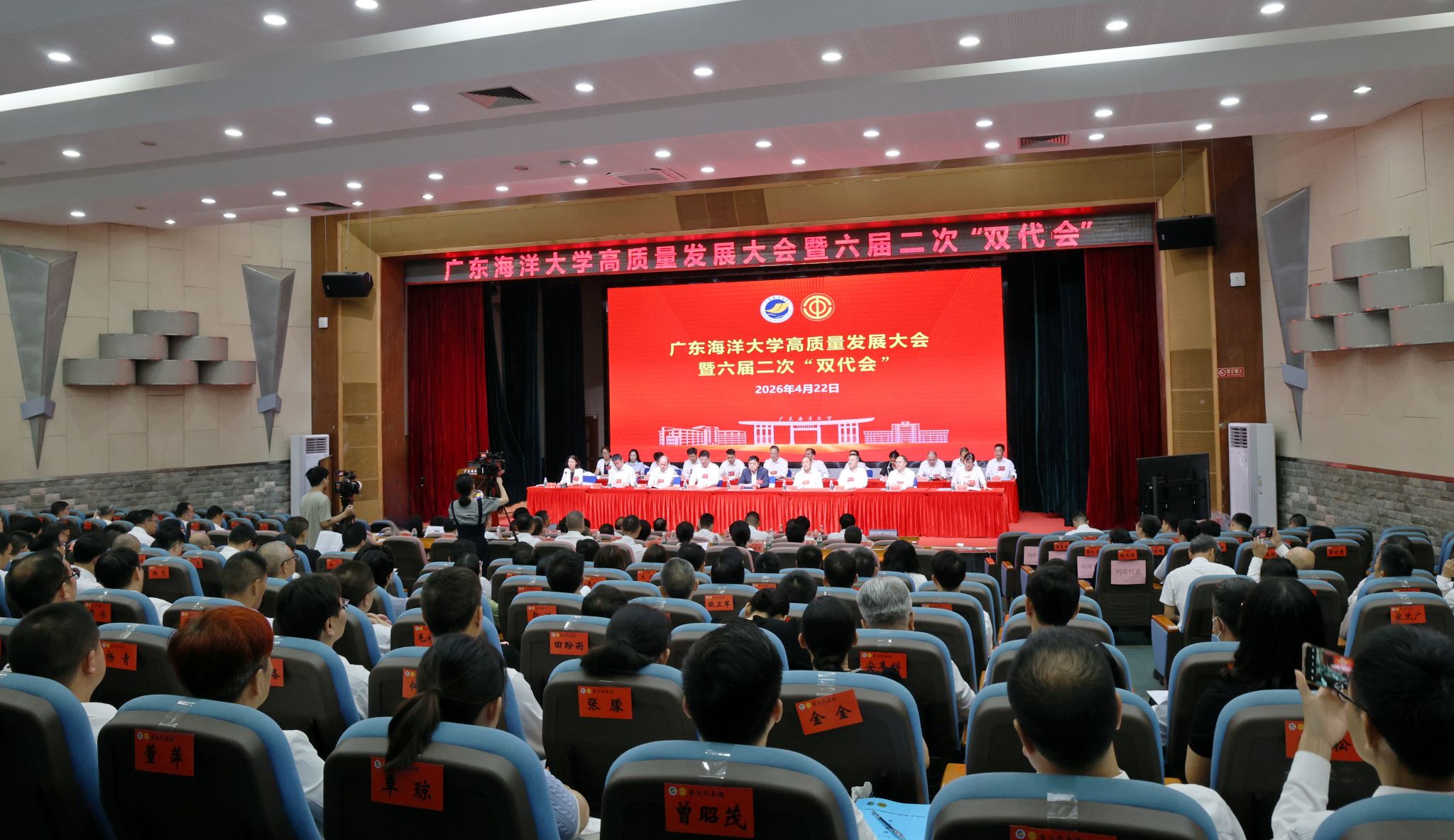 4月22日,学校高质量发展大会暨六届二次“双代会”在湖光校区广学楼多功能厅召开。大会主席团执行主席、学校领导刘文华、谭平、谭北平、宁凌、邓逢光、周昌仕、鲁义善、陈春晓,原学校领导胡日章、彭权群、陈泽球等特邀出席人员,以及大会正式代表、列席人员共270余人参加会议。学校党委副书记、校长刘文华以《勠力同心真抓实干高质量推动“十五五”事业开好局起好步》为题作学校工作报告并在闭幕会上讲话。学校党委副书记谭平主持会议并作学校工会工作报告。财务部部长白冰作学校财务工作报告。发展规划部部长林年冬作《广东海洋大学“十五五”事业发展规划(审议稿)编制工作说明》。