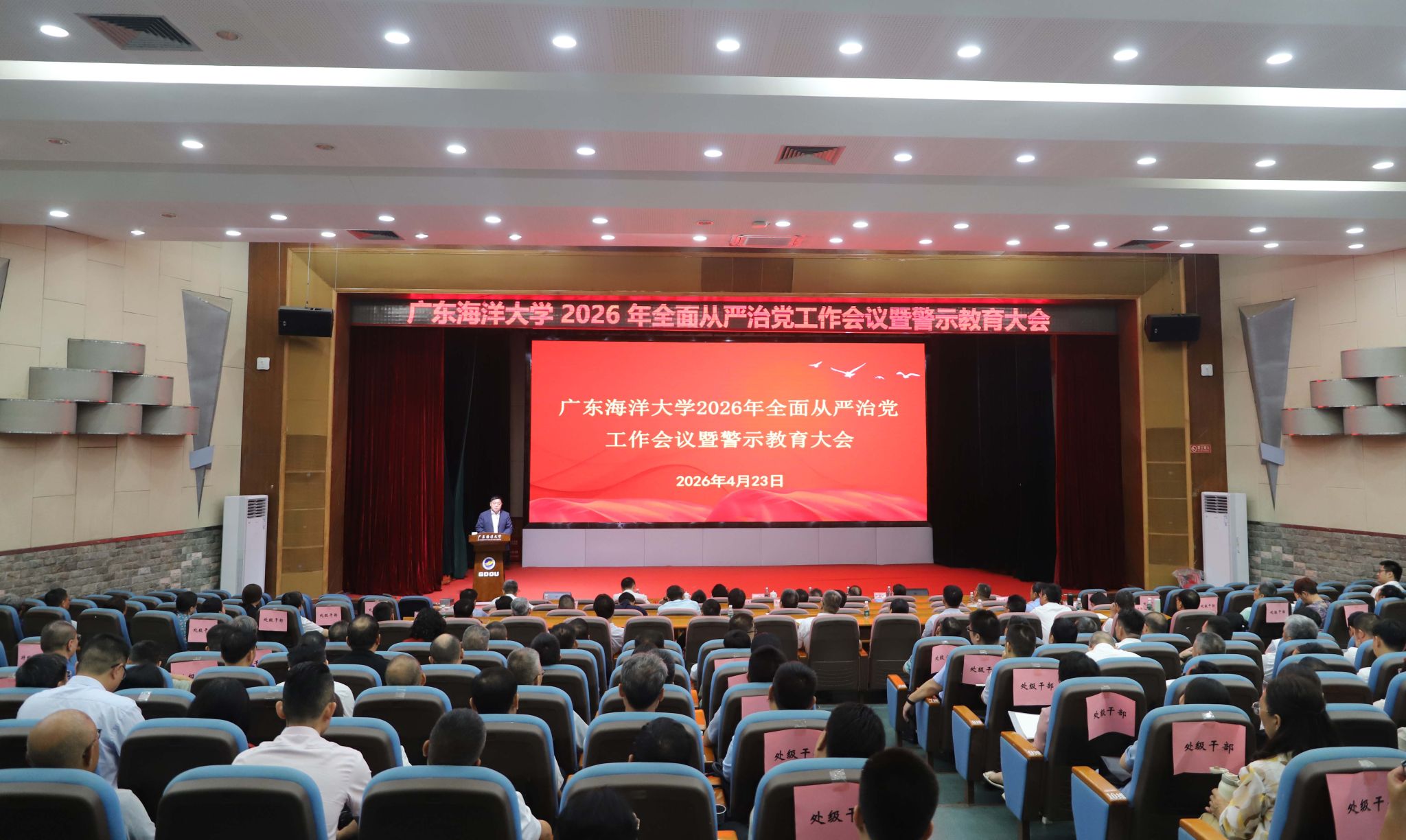4月23日上午,学校在湖光校区广学楼多功能厅召开2026年全面从严治党工作会议暨警示教育大会。学校党委副书记、校长刘文华作全面从严治党工作报告并部署突出问题整治工作,党委副书记谭平传达上级有关会议精神,党委常委、纪委书记、监察专员陈春晓主持会议并作纪检监察工作暨警示教育报告。