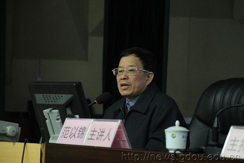 12月15日晚,容纳近400人的广东海洋大学多功能厅坐无虚席,后面的过道也站满了学生,主席台上,一位清瘦的长者正在侃侃而谈。多功能厅的LED电子屏幕上显示着“热烈欢迎范以锦先生来我校讲学”几个红色的大字。