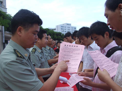 会前下起了大雨,却没有阻挡同学的热情,现场,同学们一边仔细阅读现场宣传单,一边积极向工作人员咨询有关招收的要求、待遇、去向等问题。据在场的麻章区武装部政委彭景团介绍,同学们对自己的专业能否有所发挥和应征入伍的去向等问题比较关心。报名时间截止到5月底,同学们可以到学校武装部报名也可直接到麻章区武装部报名。部队将对应征者进行体检、政审等环节的审核。