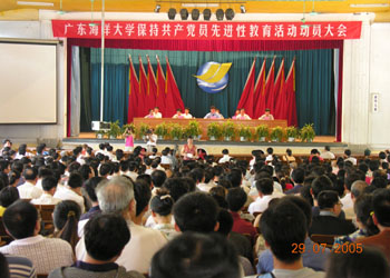 胡日章校长的讲话首先传达了今年暑期举行的全省加强和改进大学生思想政治教育工作会议及全省高校领导干部暑期读书班活动的精神。胡校长说,暑期两次全省高校领导聚会透露的信息表明,省委、省政府继续把我校列为省重点建设大学。张德江书记在会上谈及他视察过的数十所省内高校时提到两所高校,我校是其中之一。这表明省委省政府希望我校抓住重点建设的有利条件,尽快把办学水平提高到省内本科院校的先进水平。近年来我校的生源越来越好,人气越来越旺,地位也有了提高,但是要看到我们的办学质量和科研水平同省内一些先进院校相比还有较大差距。我们要有忧患意识,要奋发图强,要认准一个追赶目标,要实施名牌带动战略,争取不断实现跨越式发展,以巩固我校省重点建设大学的地位,为广东高等教育做强做大做优做出较大的贡献。胡校长重申,我校的发展定位即“为建设海洋经济强省和教育强省而服务的综合型海洋大学”是科学的,也是符合我校实际的,我们的一切努力都要围绕着这个目标进行。关于新学期工作,胡校长就开展“保先”教育活动、大学生思想政治教育工作、迎接七十周年校庆等主要工作向与会人员做了详细而具体的说明。胡校长最后代表学校党委和行政预祝全体教师教师节愉快。