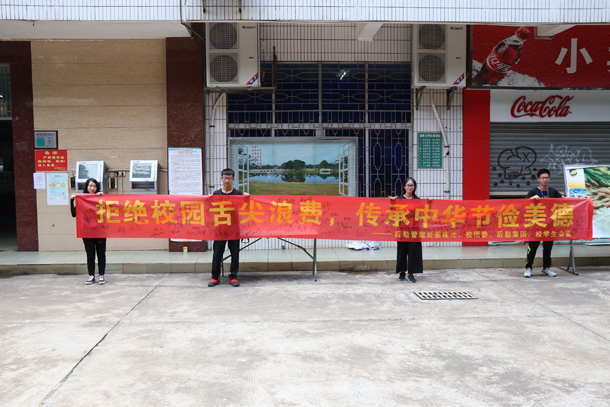 勤俭节约是中华民族传统美德。根据学校节能宣传月的工作部署,6月28日-7月1日,校团委、校学生会分别在学校第一、二、三饭堂举办以“聚餐俭为先,饭后‘光’为荣”为主题的“光盘行动”。