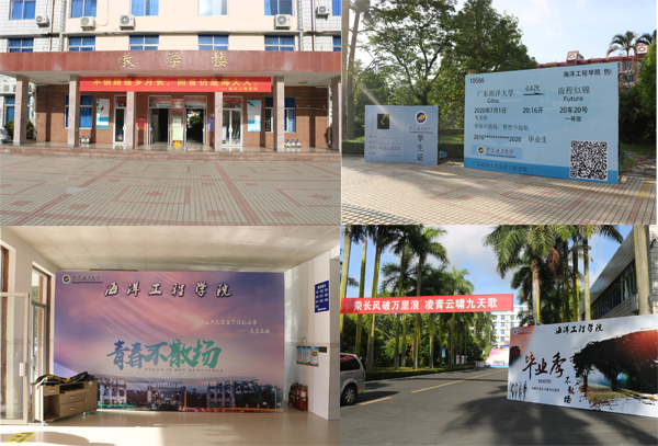 走进海滨校区,主干道、共青广场、宿舍楼前,欢迎标语随处可见,“乘长风破万里浪,凌青云啸九天歌”“2020年,我们毕业了”“毕业季不散场”“广东海洋大学开往前程似锦的20号火车票”“不惧路遥岁月长、回首仍是海大人”,欢迎欢送毕业生的氛围分外浓厚。