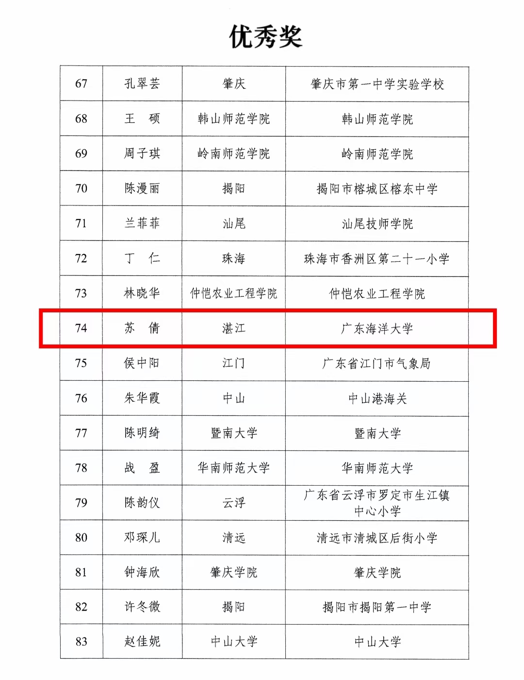 本届竞赛自启动以来,水生生物博物馆领导及老师高度重视、积极动员、多方宣传。经过培训和指导,苏倩同学在湛江市科普讲解大赛暨广东省科普讲解大赛的选拔赛中荣获二等奖,并荣获广东省科普讲解大赛优秀奖。