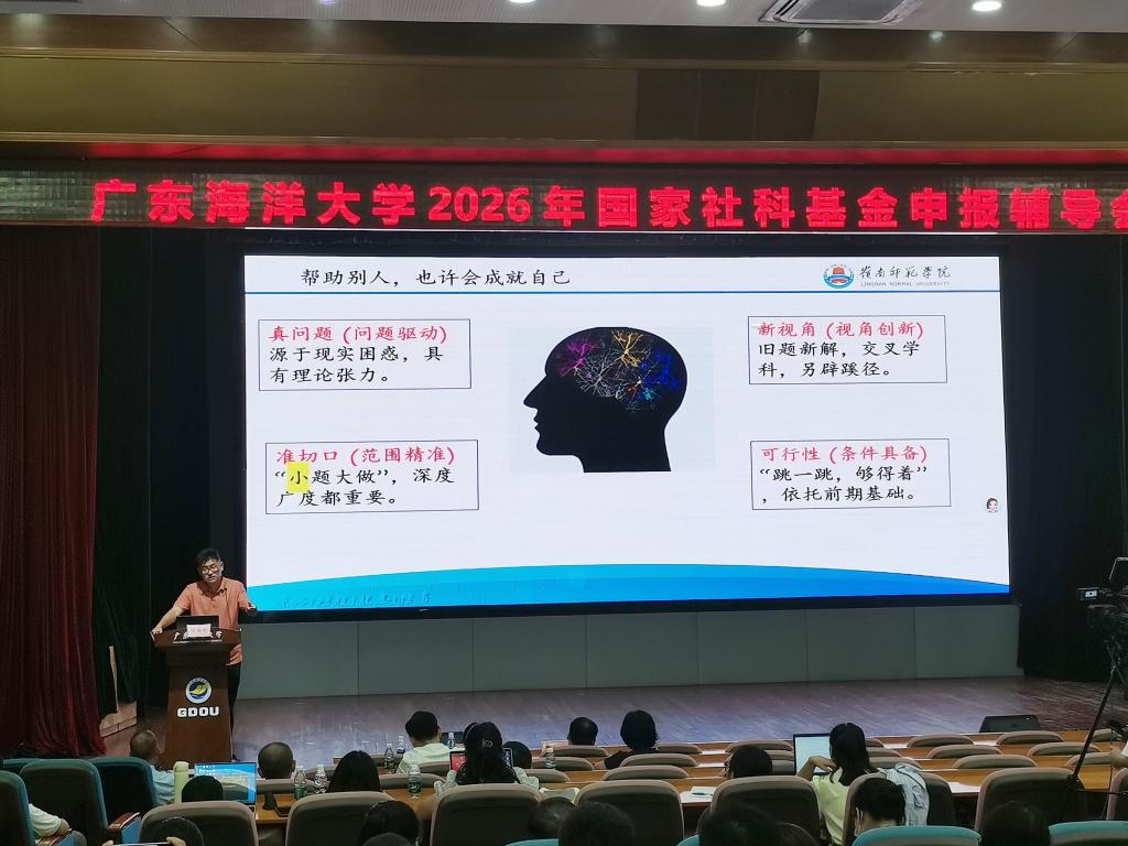 本次辅导会的举办,标志着我校2026年度国家社科基金申报工作全面启动,为进一步推动人文社会科学高质量发展奠定坚实基础。接下来,学校将以海洋牧场全产业链创新、岭南特色现代农业发展等优势研究领域为依托,加强项目前期培育与组织谋划,推动学科交叉融合与特色凝练,全面提升2026年度国家社科基金项目申报质量,进一步增强学校人文社科研究的学术影响力与社会贡献度。