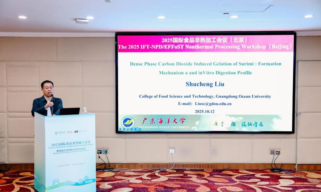 食品科技学院受邀作为本次会议的协办单位,刘书成教授作为本次会议的组织委员会委员,受邀主持了大会“基于压力的非热加工技术”分论坛,并在论坛上作了题为“Dense Phase Carbon Dioxide Induced Gelation of Surimi: Formation Mechanism andin VitroDigestion Profile”的学术报告。团队老师和研究生也分别在大会上做了学术报告,充分展示了我校“海洋食品绿色加工技术”创新团队在高密度二氧化碳、超声波、磁场、低温等离子体、高压静电场等非热加工技术的最新技术成果,并与全球食品领域的知名学者、行业领袖及企业代表共同探讨非热加工技术的前沿进展与产业化路径,推动食品产业向绿色、高效、高品质方向转型升级。