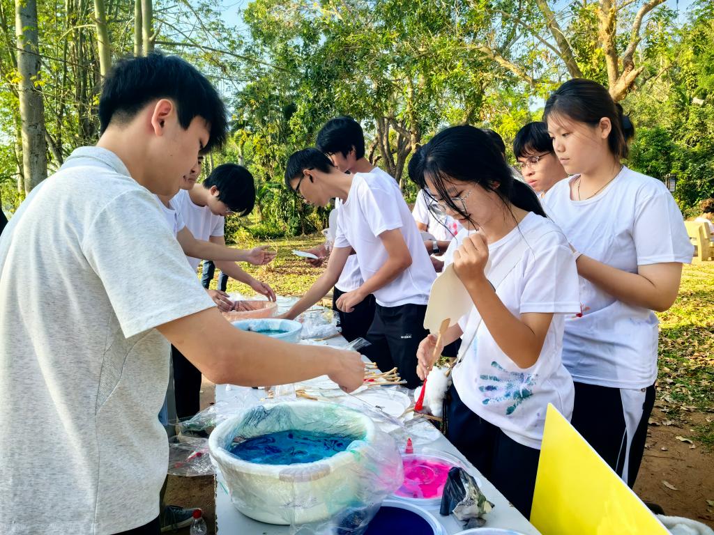 漆心相印环节中,同学们在扇面上挥洒创意,用斑斓色彩勾勒心意,在动手实践中收获成就感;膜法留言环节里,透明膜上写满对个人成长的期许与对学校校庆的祝福,字里行间饱含深情;记忆消消乐与专注力挑战环节,通过趣味任务锻炼同学们的思维敏捷度与专注力,在闯关过程中激发潜能;情绪传递站环节,4~6人组队协作,以肢体动作、面部表情传递情绪,在默契配合中增进彼此情谊;印掌跑环节,工作人员用颜料在奔跑者的白色T恤上印下专属掌印,让每一份参与都留下独一无二的色彩纪念。