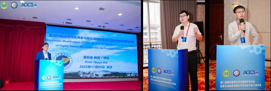 在会议上,三位老师分别以《鱼油的酶法改性及其参与复合凝聚制备高致密结构微胶囊的机制》《鱼油凝胶化关键技术开发与应用》和《金枪鱼油选择性水解中高效固定化脂肪酶体系的理性建构及催化性能强化研究》为题分享了自己的最新研究成果,得到了与会专家的关注与积极评价,展现了我校在脂质科学与健康领域的研究实力与创新活力。