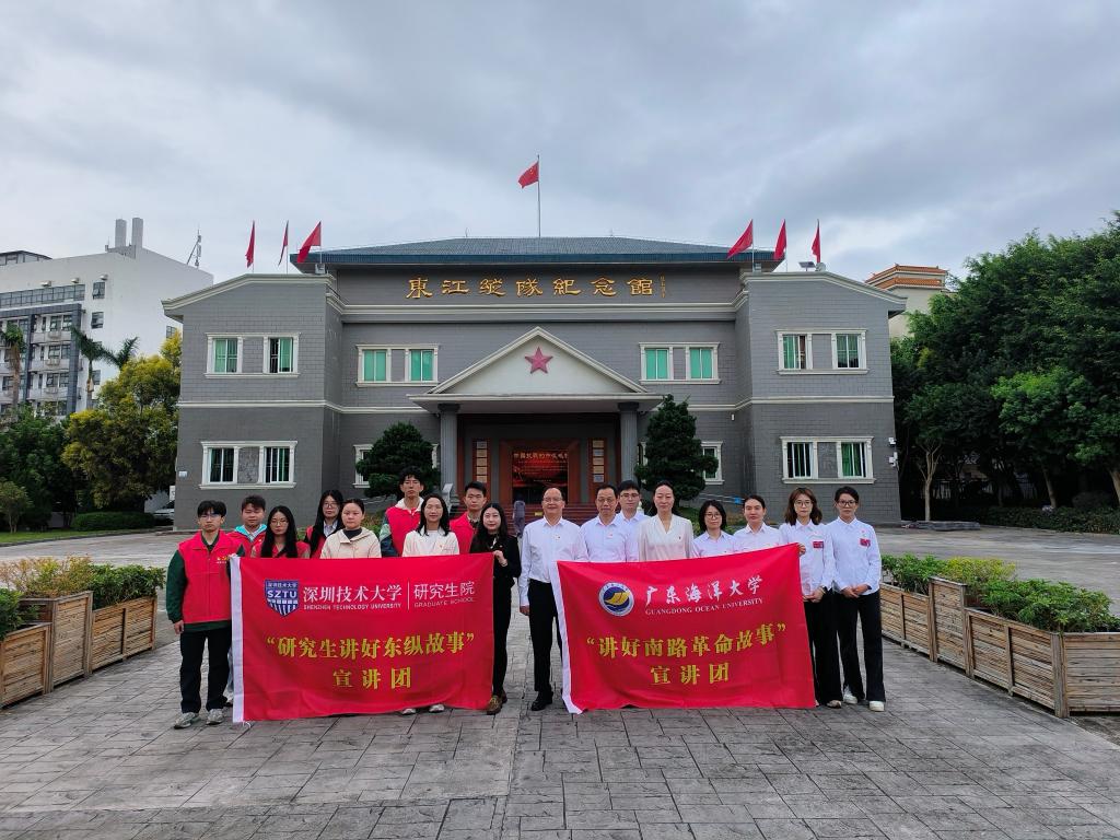 首日,团队与深圳技术大学宣讲团联合参观了东江纵队纪念馆,共同学习华南抗战历史;随后前往中共宝安县第一次党代会会址纪念馆,追寻南路革命先驱黄学增的革命足迹。次日,叶国栋分享了教育部思政工作精品项目“四位一体红色育人模式”,两名研究生宣讲员开展了“红色思政课”,双方互鉴红色育人经验。