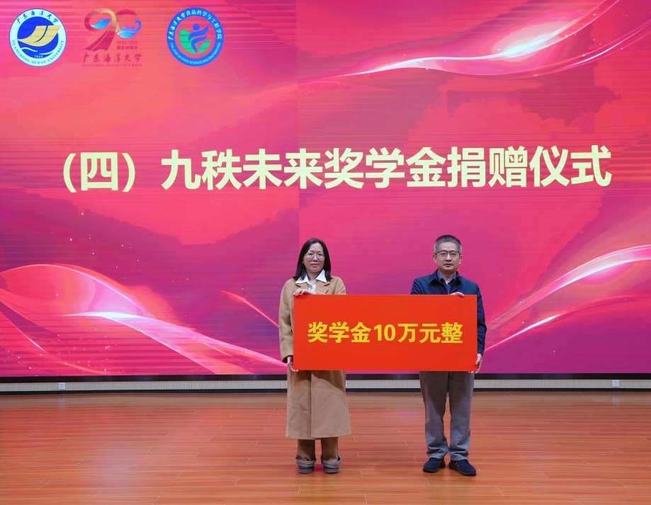 11月20日下午,食品科学与工程学院“九秩未来奖学金”捐赠仪式在海纳楼113报告厅举行。我校阳江校区党委副书记丁永成,校区学生事务部部长孙学甫,食品科学与工程学院党委书记夏杏洲,院长朱思明,捐赠人、广东蔚徕实验室科技发展有限公司负责人、优秀校友唐碧蓉伉俪,学院全体辅导员、教师代表及学生代表参会,仪式由夏杏洲主持。