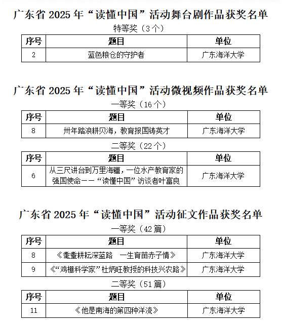 近日,教育部关工委和广东省教育系统关工委相继公布2025年“读懂中国”活动评审结果,我校喜获佳绩,选送的6个作品均获得省级二等奖以上奖项,学校同时获评教育部关工委表扬单位和省教育系统关工委“优秀组织奖”。其中,舞台剧作品《蓝色粮仓的守护者》获评教育部关工委“优秀舞台剧”奖、广东省教育系统关工委特等奖;微视频《卅年踏浪耕贝海,教育报国铸英才》获评广东省教育系统关工委一等奖;微视频《从三尺讲台到万里海疆,一位水产教育家的强国使命——“读懂中国”访谈者叶富良》获评广东省教育系统关工委二等奖;征文作品《耄耋耕耘深蓝路 一生育苗赤子情》《“鸡棚科学家”杜炳旺教授的科技兴农路》均获评广东省教育系统关工委一等奖;征文作品《他是南海的第四种洋流》获评广东省教育系统关工委二等奖。
