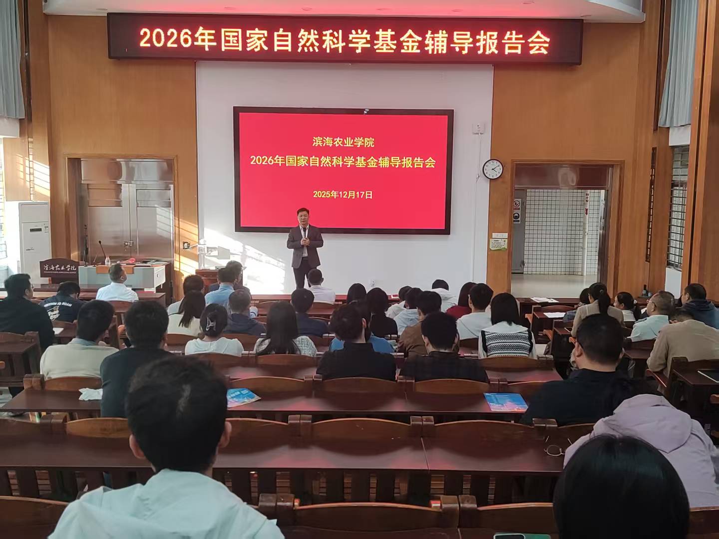12月17日下午,滨海农业学院在湖光校区兴农楼109报告厅召开2026年度国家自然科学基金申报动员会。学校科学技术部部长颜云榕,学院党委书记郑殿峰、院长马驿以及学院教师及博士后代表等70余人参会。会议由副院长沈雪峰主持。