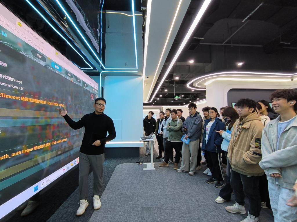 实习队伍在360南沙研发中心参观技术展示区与研发办公区详细了解了研发中心的技术布局及在网络安全、人工智能等领域的创新成果。现场通过案例分析等形式直观呈现了前沿技术在实际场景中的应用,让学生们深刻感受到科技研发的魅力与力量。交流答疑环节中,研发中心的技术骨干就学生关心的技术研发流程、行业人才需求等问题进行了深入讲解。