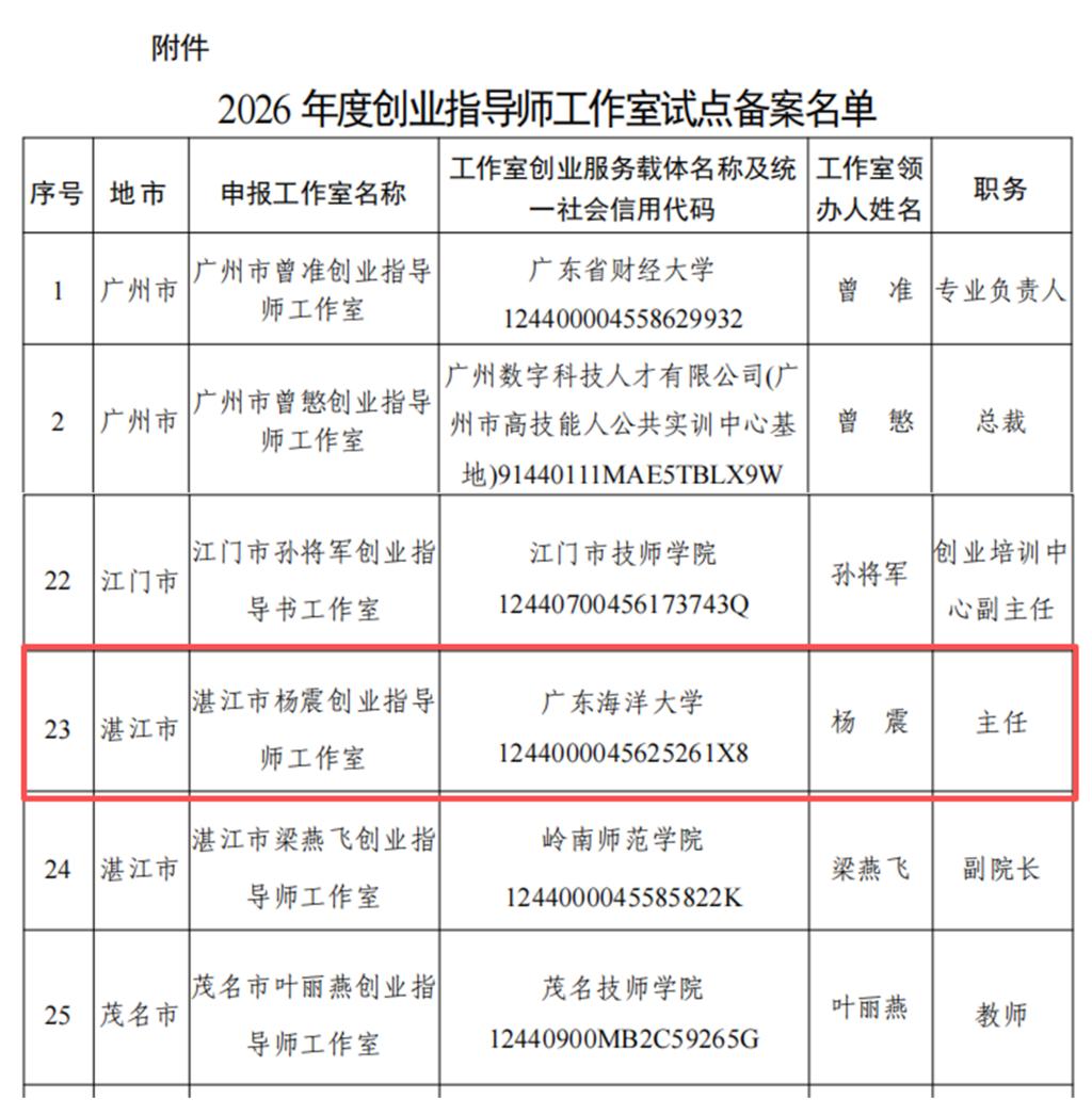 近日,经自主申报、湛江市人力资源和社会保障局审核推荐,以我校创新创业学院办公室主任杨震为领办人的“湛江市杨震创业指导师工作室”通过广东省人力资源和社会保障厅备案,入选全省创业指导师工作室试点建设名单。这是我校在创业指导服务平台建设领域的重大突破,也是首个获省级人社部门试点备案的创业指导类工作室,标志着我校创新创业教育与社会服务能力获得省级主管部门的认可。