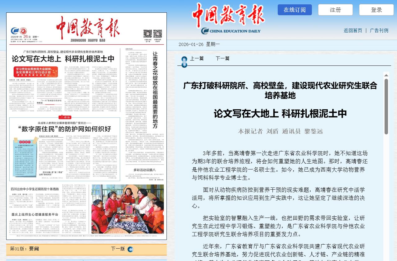 1月26日,《中国教育报》头版头条刊发报道,聚焦广东海洋大学与广东省农业科学院联合培养的研究生金永燕的先进事迹,以《广东打破科研院所、高校壁垒,建设现代农业研究生联合培养基地论文写在大地上科研扎根泥土中》为题,鲜活展现其立足产业一线开展科研实践的成长历程。这既青年学子深耕实践、成长成才的充分肯定,也是我校以产教融合、科教融汇为核心,扎实推进研究生联合培养工作生动体现。作为涉海涉农特色鲜明的高校,我校始终以产教融合、科教融汇为重要抓手,走出了一条特色彰显、成效突出的研究生联合培养之路。