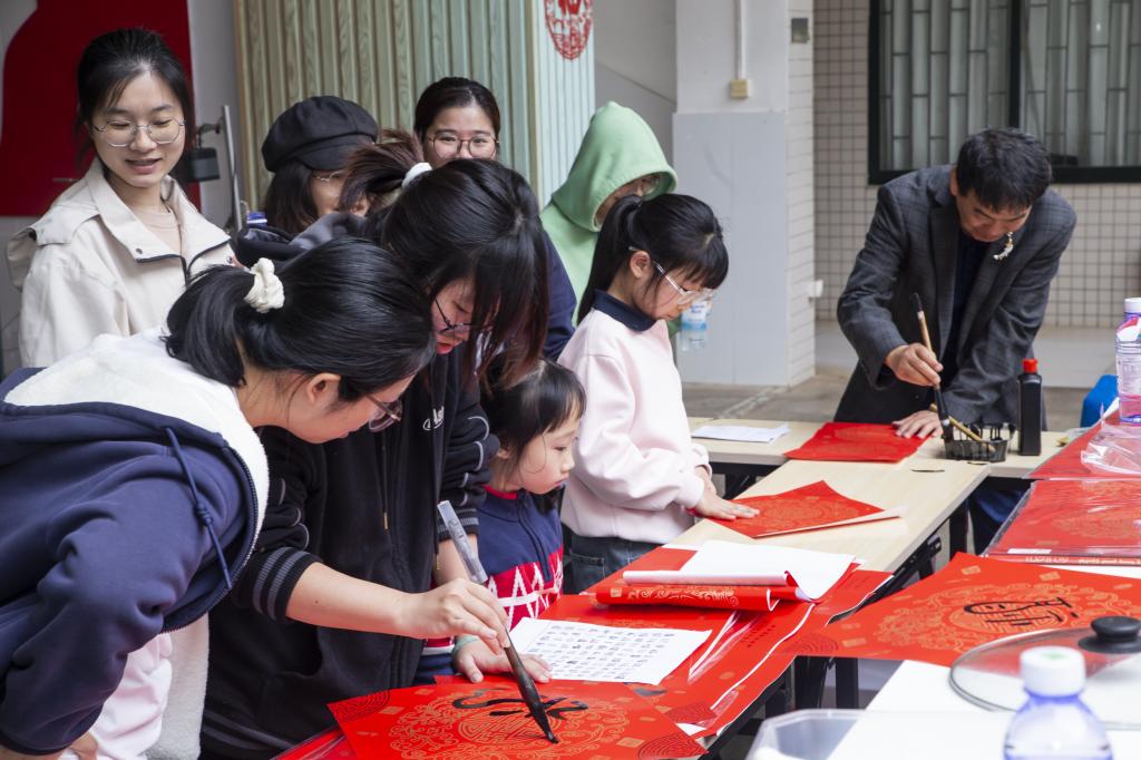 活动现场一派红火祥和,水产楼一楼大厅挂起灯笼、贴上春联,洋溢着浓浓的节日气氛。杨洲等校领导与师生们一起动手擀面团、包饺子、话家常,亲切询问同学们的学习进展与生活状况,现场笑语不断、温情流淌。校关工委副主任劳赞即席挥毫,为师生书写春联,送上真挚的新春祝福。