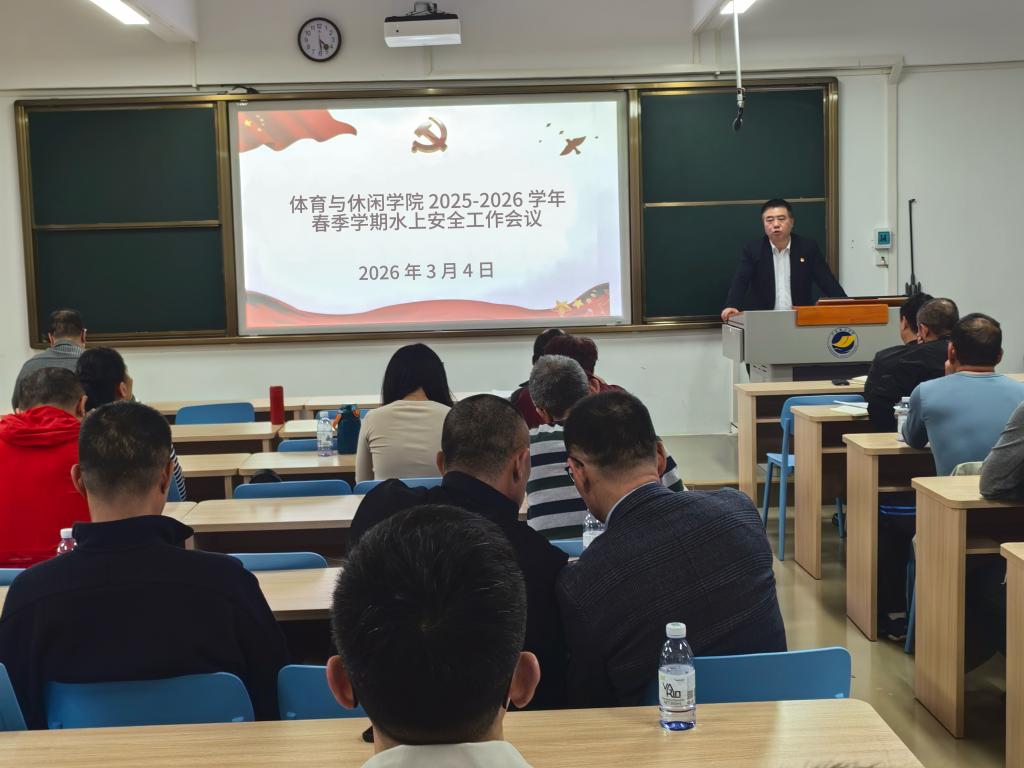 3月4日下午,体育与休闲学院在广学楼804会议室组织召开了2026年春季学期水上教学安全工作会议。学院领导班子成员、各系部中心负责人、全体水上教学任课教师、教学管理人员及游泳池安全管理人员参加会议。会议由学院副院长施俊华主持。