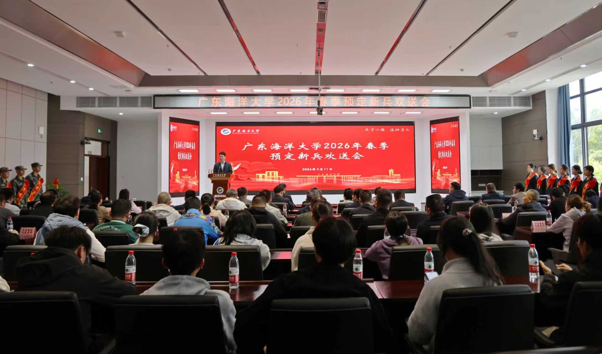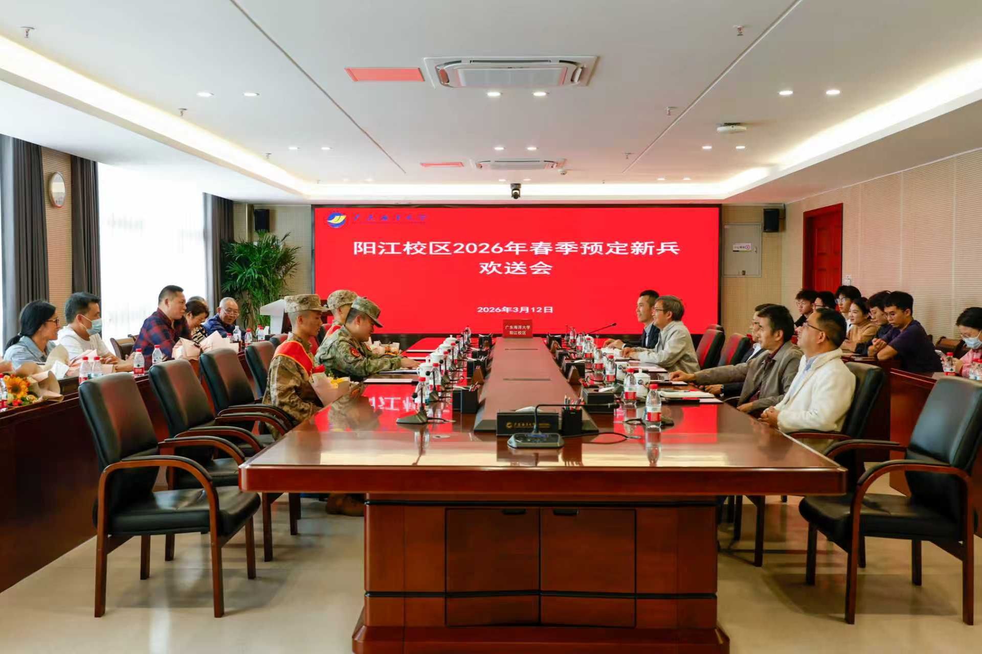 3月11日、12日,我校2026年春季预定新兵欢送会分别在湖光校区博文楼A座202室和阳江校区海纳楼712会议室举行,为即将踏上军旅征程的新兵同学们壮行送别。学校党委副书记谭平,党委常委、副校长鲁义善出席湖光校区会议。学校相关职能部门主要负责人,各学院党委书记、副书记、副院长,2026年春季预定新兵,兼职武装老师、辅导员、班主任、家长代表及学生代表参加活动。保卫部(武装部)部长袁仁广主持湖光校区会议,阳江校区学生事务部部长孙学甫主持阳江校区会议。