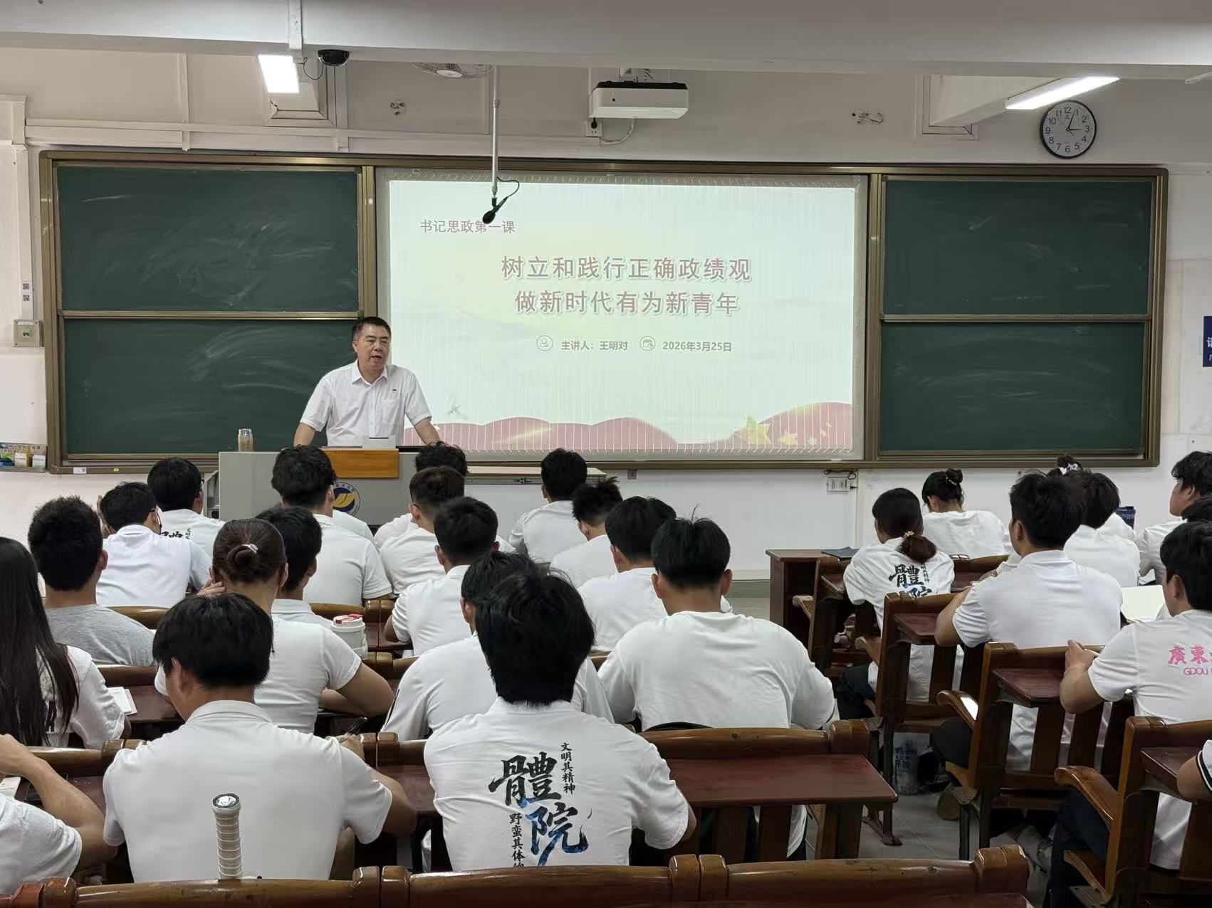 为深入学习贯彻习近平新时代中国特色社会主义思想,落实立德树人根本任务,3月25日,体育与休闲学院党委书记王明对以《树立和践行正确政绩观,做新时代有为新青年》为题,在广学楼313教室为学院全体学生党员、入党积极分子、团委学生会干部、班长、团支书讲授了一堂“思政第一课”。