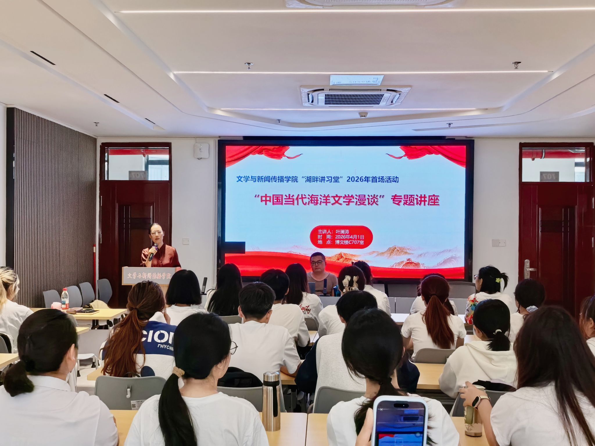 4月1日下午,文学与新闻传播学院“湖畔讲习堂”2026年首场报告会在博文楼C707会议室举行,学院叶澜涛副教授作《中国当代海洋文学漫谈》专题讲座。学院党委书记张艳梅主持会议。40余名学生现场聆听讲座。本场讲座旨在以海洋文学为媒,厚植青年学生海洋情怀,凝聚海洋强国建设的精神力量。