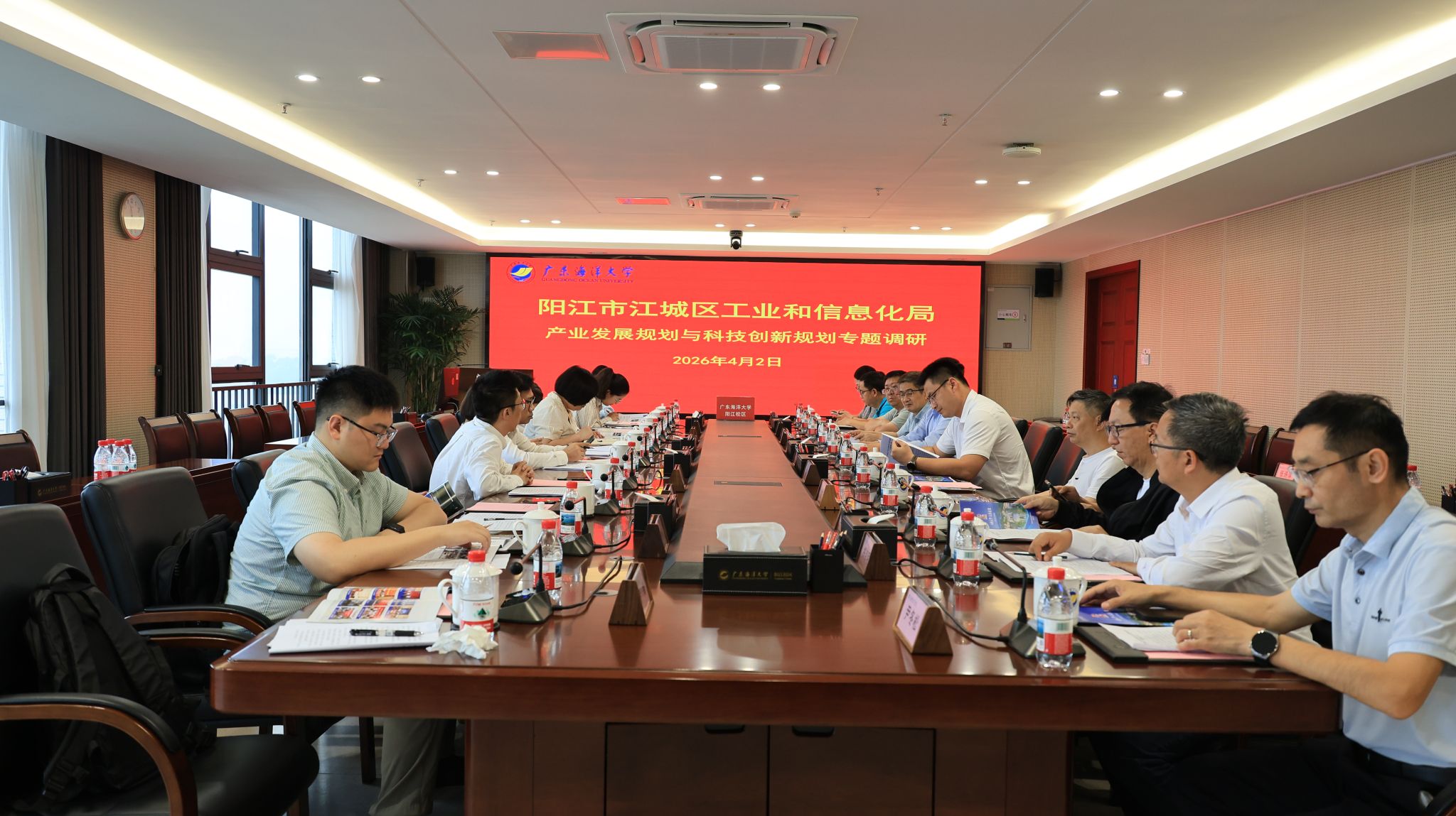 4月2日,阳江市江城区工业和信息化局局长程国就及广东省国际工程咨询有限公司专家一行,到阳江校区开展产业发展与科技创新专题调研。校区党委委员、管理办公室副主任、教学科研部部长白浚宇,各学院负责人及相关人员参加调研活动。