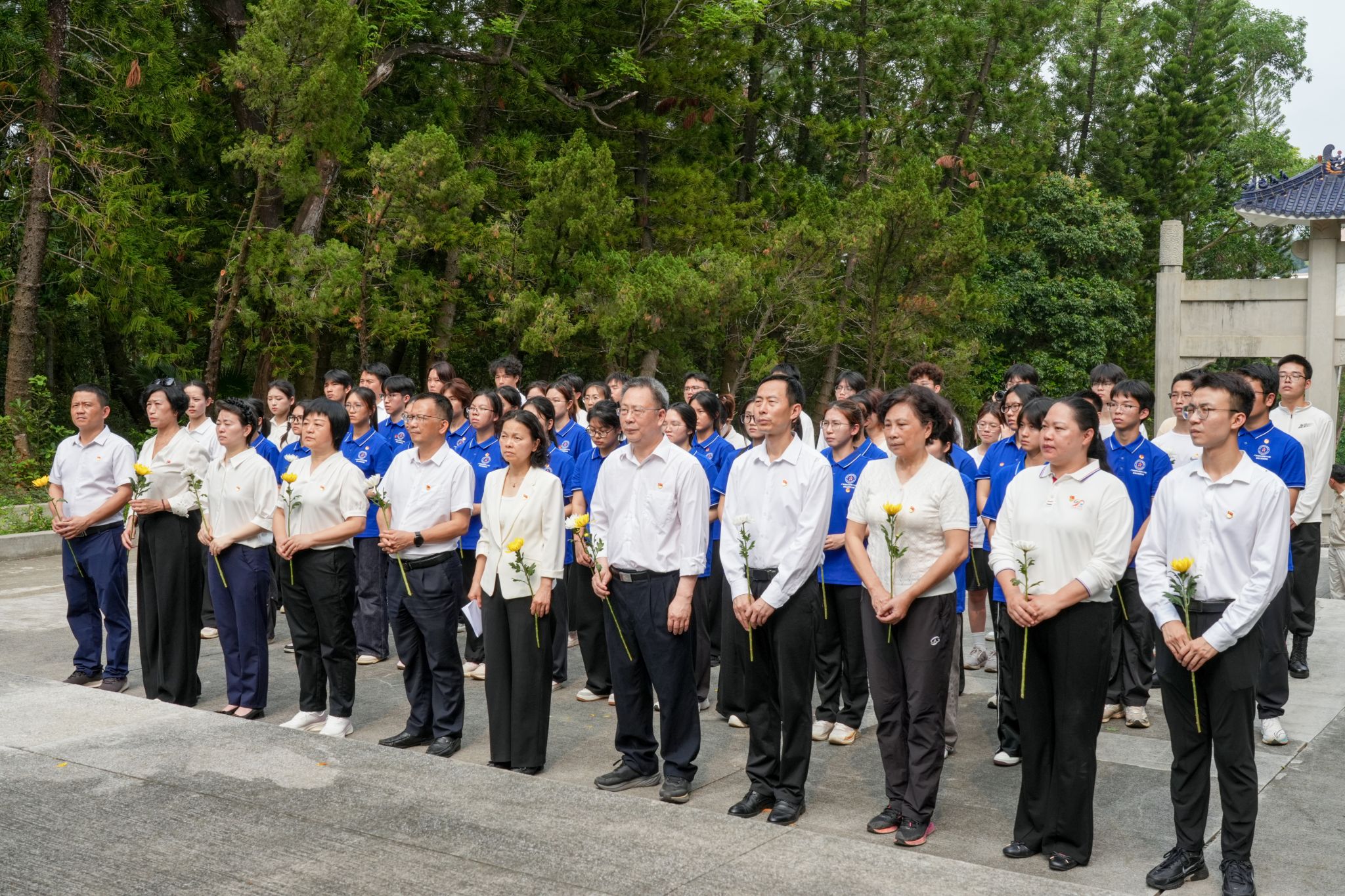 下午3时,全体师生在革命烈士纪念碑前整齐列队,庄严肃立,国旗护卫队礼兵向烈士纪念碑敬献花圈,全体人员行注目礼,向革命烈士默哀,深切缅怀为中国人民解放事业和共和国建设事业英勇献身的先烈们。