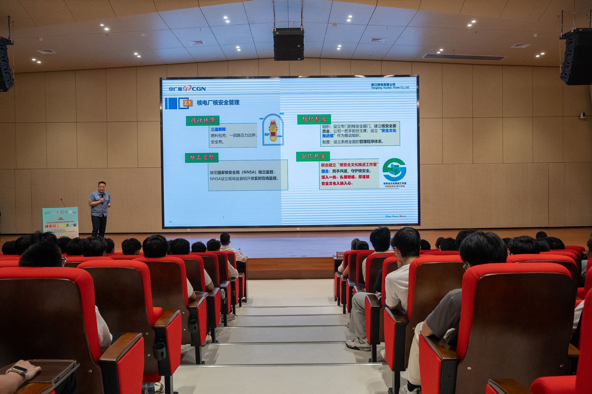 阳江核电有限公司培训部李振清围绕核电发展前景、核安全管理体系、生活中的核安全、辐射防护与核应急常识等方面,系统讲解了核安全文化及核电相关知识。现场气氛活跃,互动热烈。