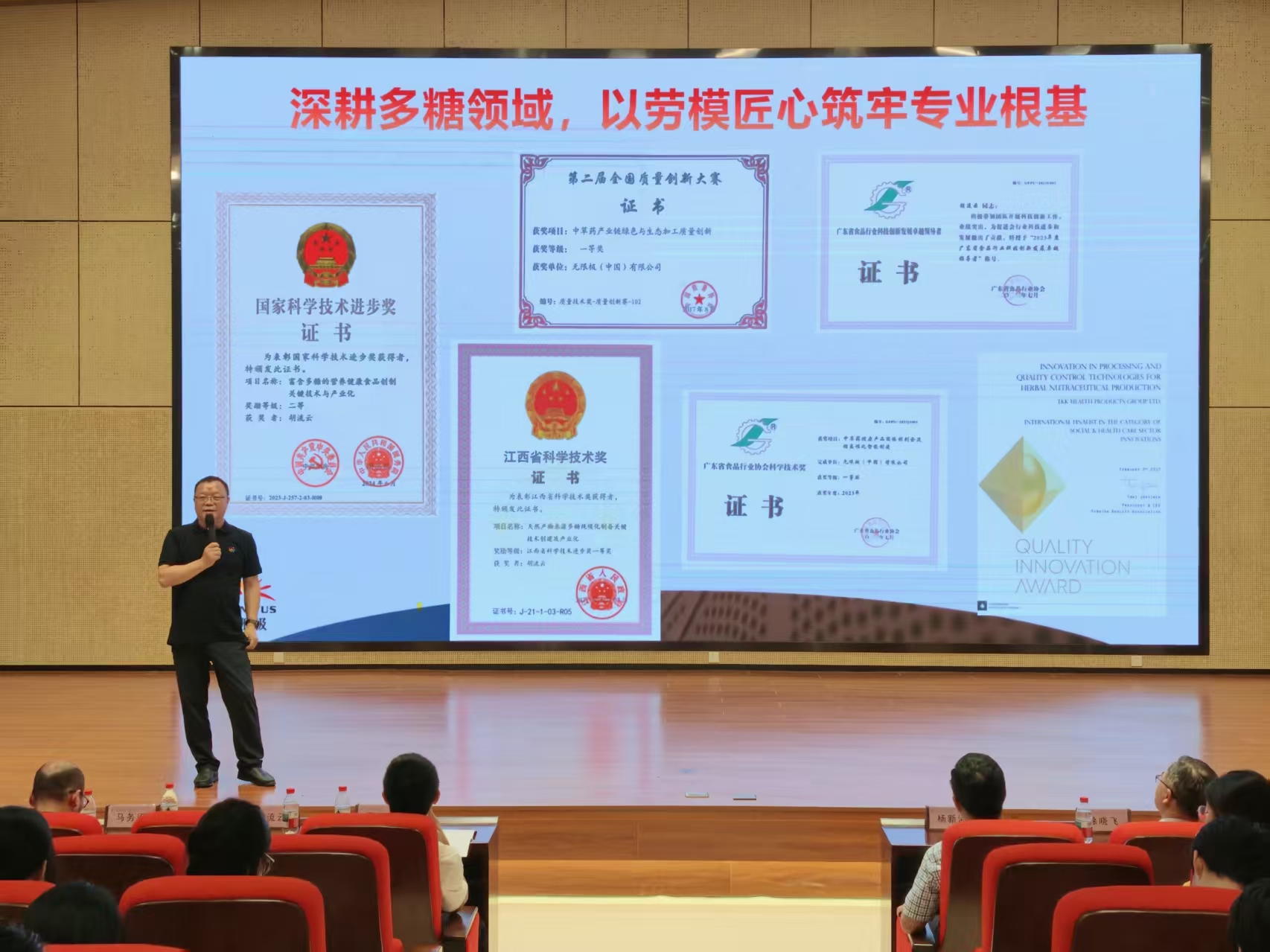 讲座现场,胡流云结合自身成长历程,以朴实的语言、生动的案例深刻阐释了新时代劳模精神的丰富内涵与时代价值,分享了自己在行业深耕过程中的奋斗故事与心得体会。胡流云重点介绍了无限极在智能制造、绿色工厂建设、数字化智能管理等方面的创新发展成果,展现了行业前沿发展趋势。他勉励青年学子要立足专业、深耕细作,既要夯实专业基础,也要勇于跨界探索、突破创新,始终牢记时代使命,以奋斗之姿筑梦新时代。