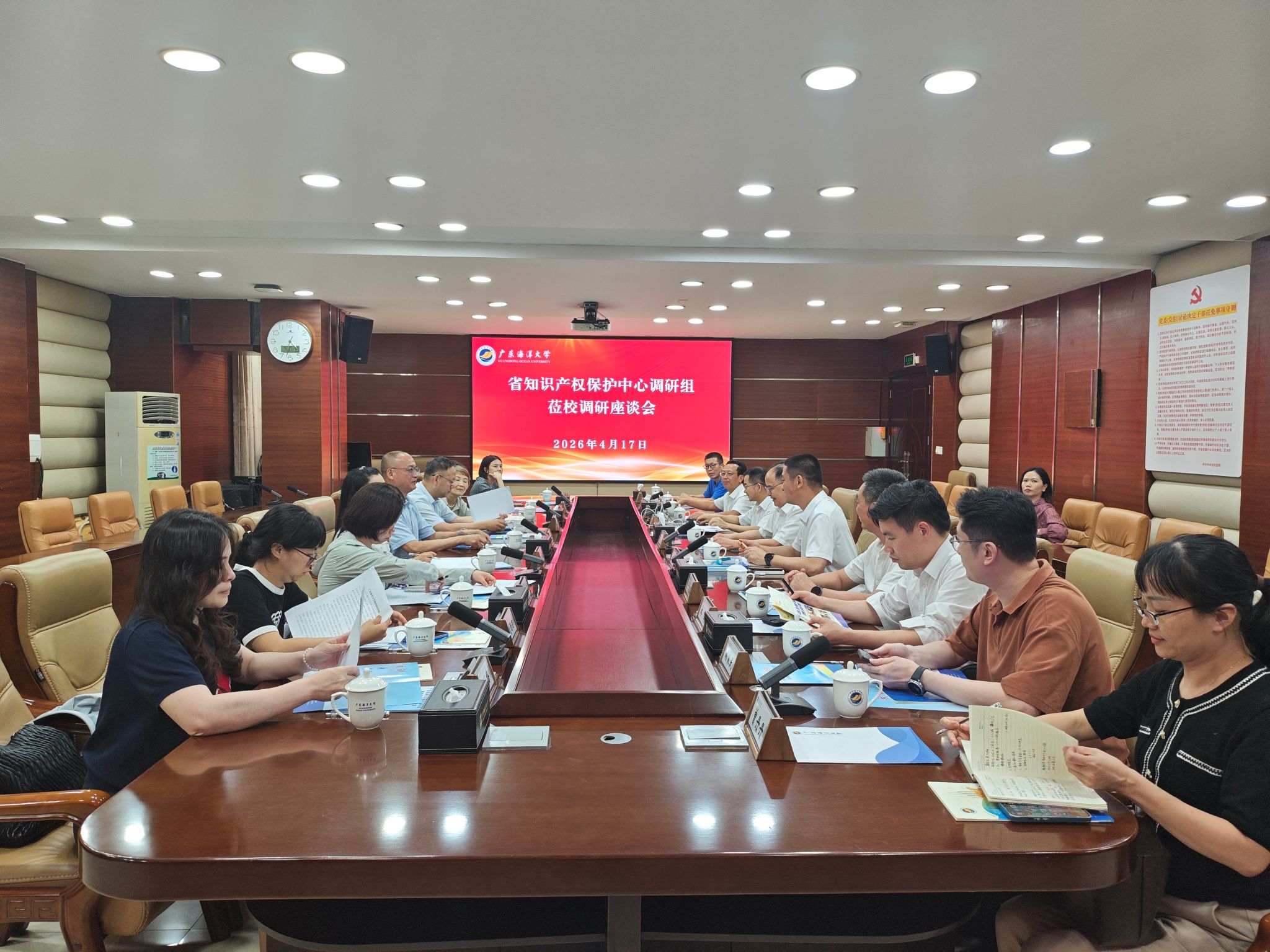 4月17日下午,广东省知识产权保护中心党委委员、副主任邱庄胜率领调研组到我校湖光校区,专题调研知识产权与成果转化工作,学校党委常委、副校长周昌仕参加调研并主持座谈会。湛江市市场监督管理局总工程师叶国琳参加了调研。