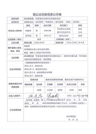 根据《关于进一步规范省部级以下国家工作人员因公临时出国的意见》的要求,现将广东海洋大学因公出访信息予以公示。公示时间为2016年08月15日至08月21日。如有意见,请在公示期内,向相关单位反映。(对外联络处电话:0759-2396206;纪委办电话:0759-2383501)