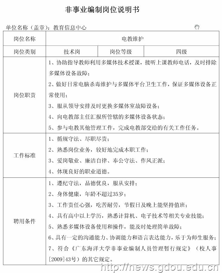 根据《关于印发< 广东海洋大学非事业编制岗位设置和人员聘用实施方案>的通知》(校人事〔2013〕40号)精神和学校工作的需要,我校现向社会公开招聘非编合同工1名。岗位的基本信息如下(岗位说明书见附件):
