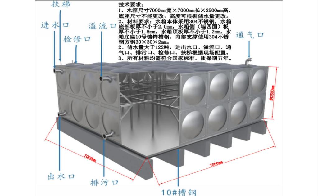 规格参数详见附件二:不锈钢水箱设计图;质保:5年。 |