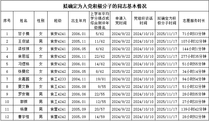 根据《广东海洋大学发展党员工作细则》(广海大党〔2021〕191号)规定,经本人提出申请,团组织推优,在听取培养联系人、党员和群众意见的基础上,根据最近一学年平均学分绩点或综合测评年级专业排名不超过40%,志愿服务时长20小时以上(含20小时),遵守国家法律法规及校规校纪,同等条件下,优先考虑将学生干部或获得突出奖项、有突出贡献者确定为入党积极分子等标准,经食品科学与工程学院学生党支部集体讨论研究决定,拟将甘子楠等12名同志确定为入党积极分子。现将其有关情况予以公示,征求党员、群众意见。
