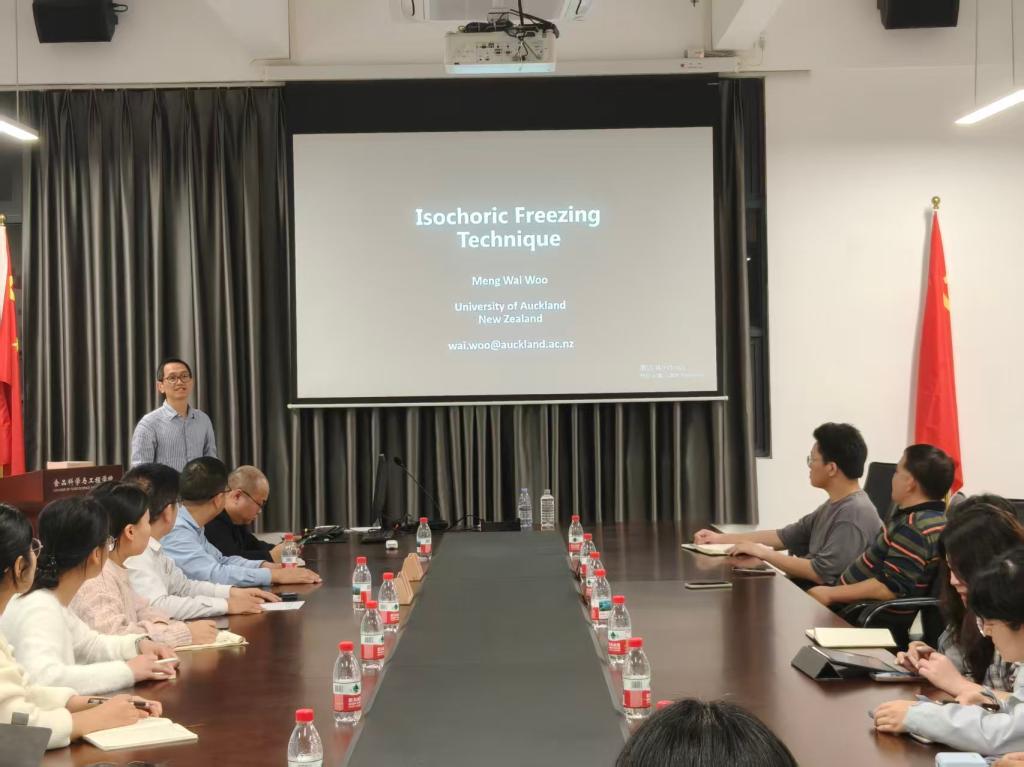 为庆祝广东海洋大学建校九十周年,活跃校园学术氛围,增强国际交流合作,2025年12月1日,食品科学与工程学院特邀新西兰奥克兰大学化学与材料工程系副教授、博士生导师Meng Wai Woo(胡明威博士)来校交流,并作了题为“Isochoric freezing - unexpected freezing behaviour with pure water”的英文学术报告。