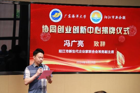 在揭牌仪式上,阳江市新生代企业家联合会常务副主席冯广亮首先致辞。他希望合作双方能够通过协同创业创新中心这个平台,整合和匹配阳江新生代企业协会的企业群体和广东海洋大学各方面资源优势和需求,加强校企合作,努力携手培养具备专业管理素养和创新思维的卓越人才,提升商学院毕业生的就业水平,同时也为阳江地区产业发展注入人才活力。