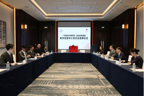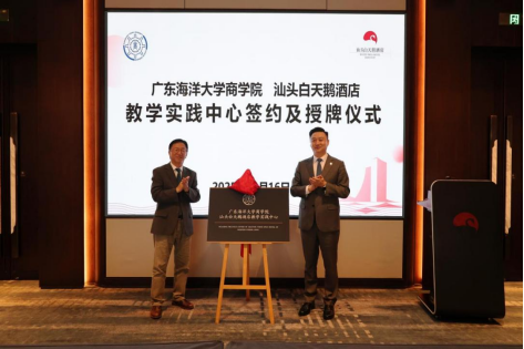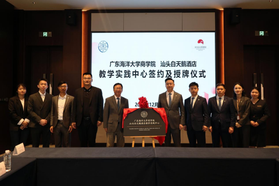 2025年12月16日下午,广东海洋大学商学院与汕头白天鹅酒店教学实践中心签约及授牌仪式在汕头隆重举行。广东海洋大学商学院院长李力教授、广东海洋大学阳江校区教学科研部部长白浚宇、旅游管理系主任隆斐和汕头白天鹅酒店总经理唐俊峰、副总经理孔三点、罗刚等及合作双方代表参加座谈和签约仪式,共同见证广东海洋大学商学院以创新创业为导向的旅游管理专业人才培养新范式落户汕头白天鹅酒店,也显示了几年来广东海洋大学商学院与广东白天鹅酒店集团合作的最新成果。