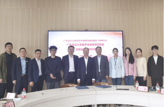 2025年12月19日 广东海洋大学移动数字孪生旅游实验室战略合作签约仪式在广东海洋大学阳江校区济航楼203室举行。广东海洋大学党委常委、副校长、阳江校区党委书记、管理办公室主任周昌仕、商学院院长李力、副院长张欢、移动数字孪生旅游实验室负责人白卫静、问途数字营销实验室负责人王佳和中国移动集团广东有限公司行业首席专家张骏恺、阳江分公司总经理周宁、副总经理许志海、战略客户中心副总经理梁东、战略客户中心农商文旅事业部总监等,合作双方代表参加了本次签约活动。