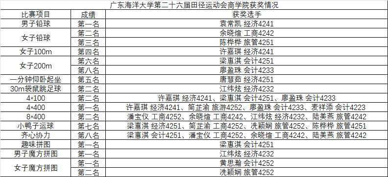 11月19日和12月6日,阳江校区第四届田径运动会与学校第二十六届田径运动会相继圆满落幕。商学院学子凭借卓越实力与不懈拼搏,以优越的成绩续写了“商院健儿当自强”的辉煌篇章。值得一提的是,这已是商学院学子连续三年在阳江校区运动会中斩获团体总分第一的佳绩,也是连续两年以主力成员身份代表阳江校区参加学校运动会并帮助校区荣获学生团队第一名,彰显了学院体育育人的丰硕成果。