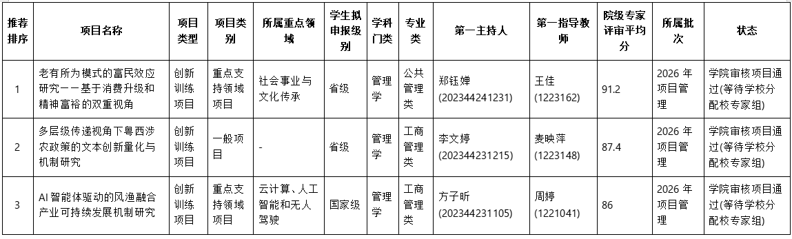 根据学校《关于开展 2026 年度发展性项目征集入库工作的通知》(校财务(2025)2号)的要求,创新创业学院启动我校2026年大学生创新创业训练计划项目(以下简称“大创项目”)入库申报工作。学院参照《广东省教育厅关于开展 2025 年大学生创新创业训练计划立项申报和结题验收工作的通知》,《国家级大学生创新创业训练计划管理办法》(教高函(2019)13号)、《广东海洋大学大学生创新创业训练计划项目管理办法》(校(2025)22号)的文件精神,根据《关于开展 2026 年大学生创新创业训练计划项目征集入库与结题验收工作的通知》做好项目入库申报工作。经学院组织专家评审,目前商学院拟上报情况如下,依照规定公示: